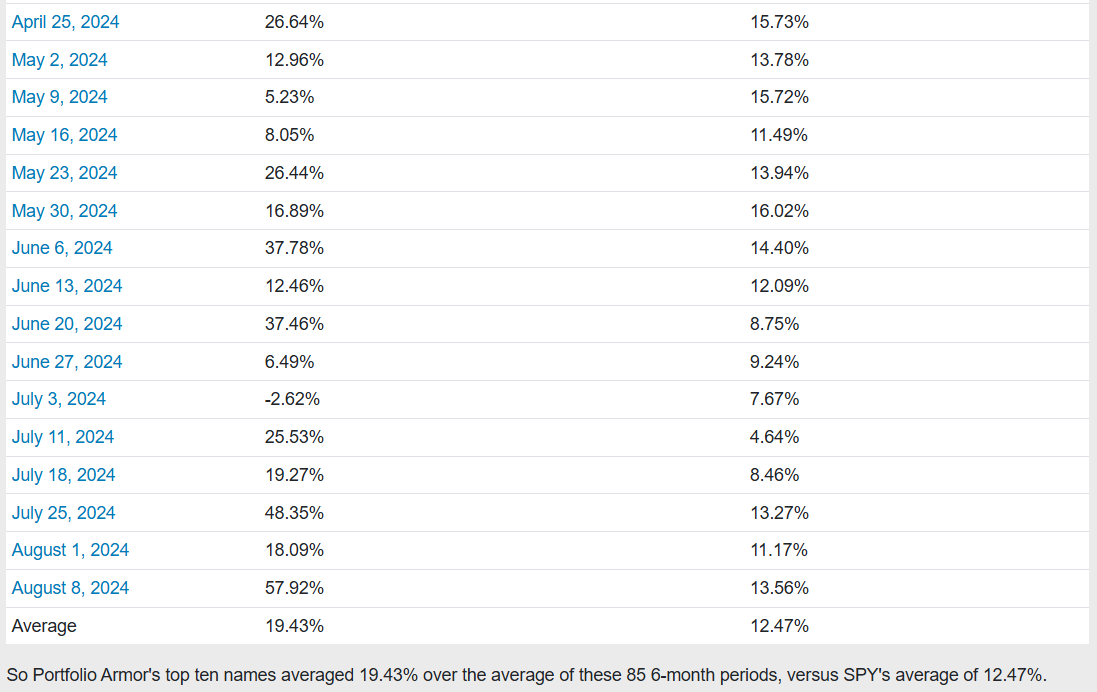 And as you can see above, our top names have averaged returns of 19.43% over the next six months, versus SPY’s average of 12.47%. You can see an interactive version of the table above here, where you can click on each date and see a chart showing each of the holdings that week.
