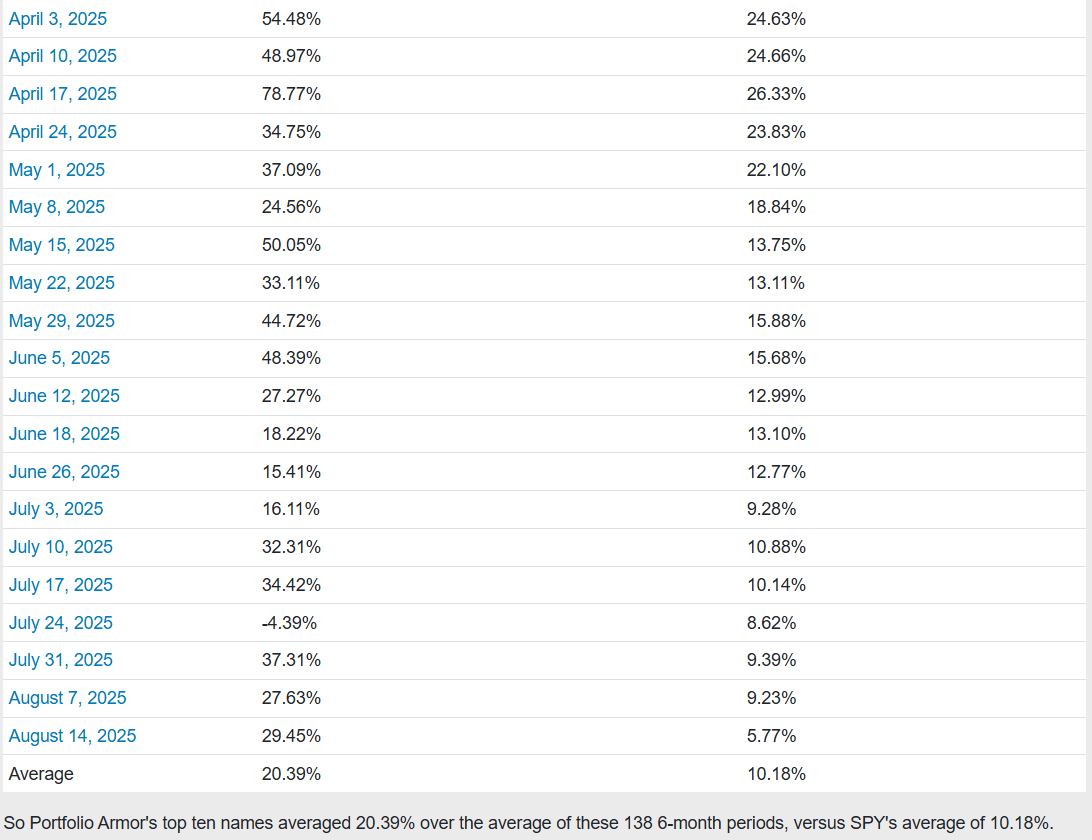 Over the next 6 months, our top ten names from August 14th, 2025 returned +29.45%, versus +5.77% for the SPDR S&P 500 Trust ETF (SPY 0.23%↑).