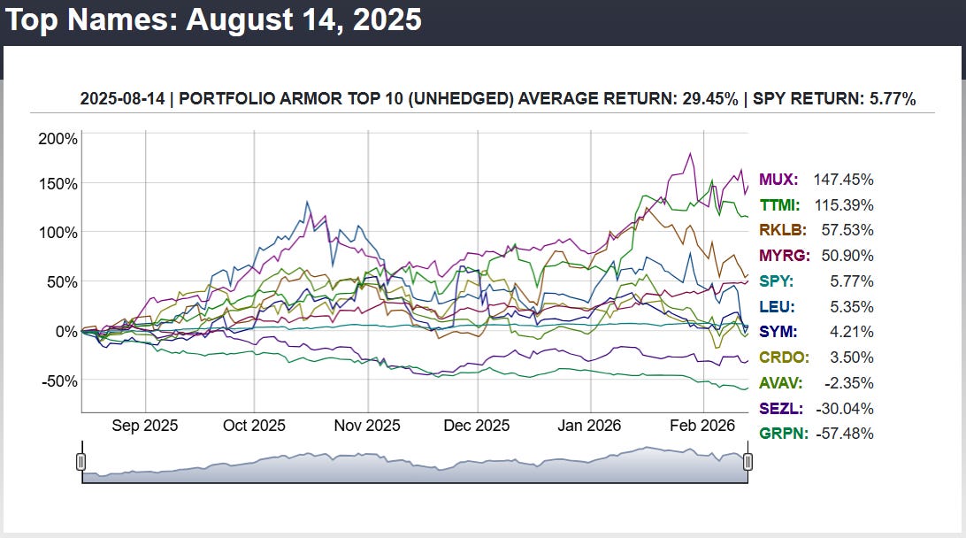 Before we get to this week’s top ten names, let’s look at the final, 6-month performance of our top ten names from 8/14/2025.