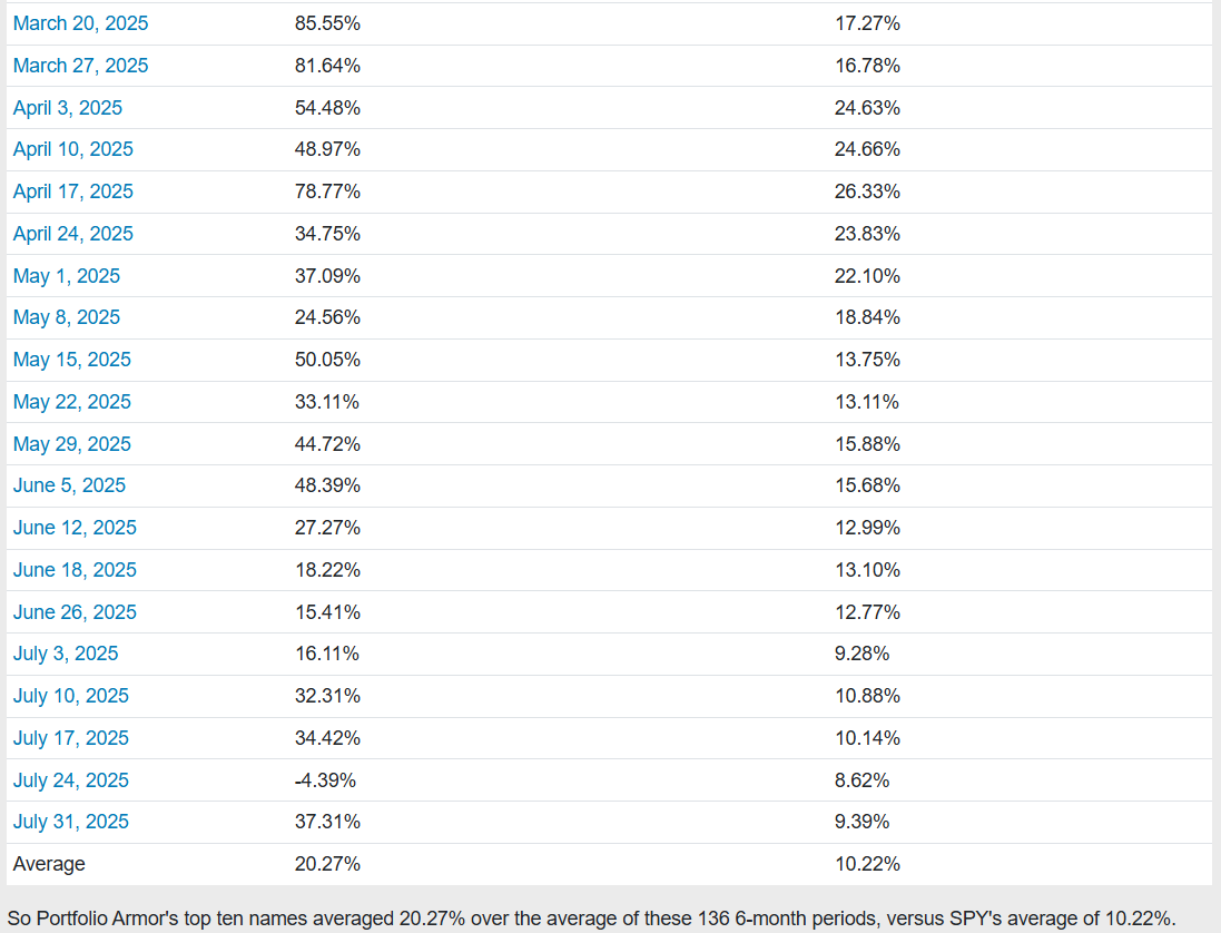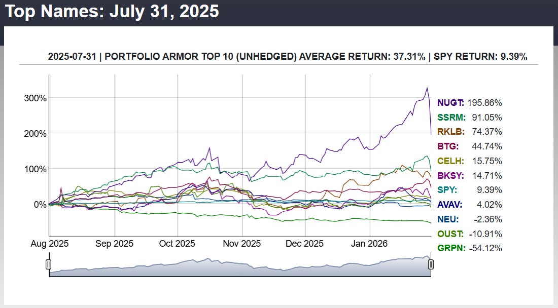 Before we get to this week’s top ten names, let’s look at the final, 6-month performance of our top ten names from 7/31/2025.