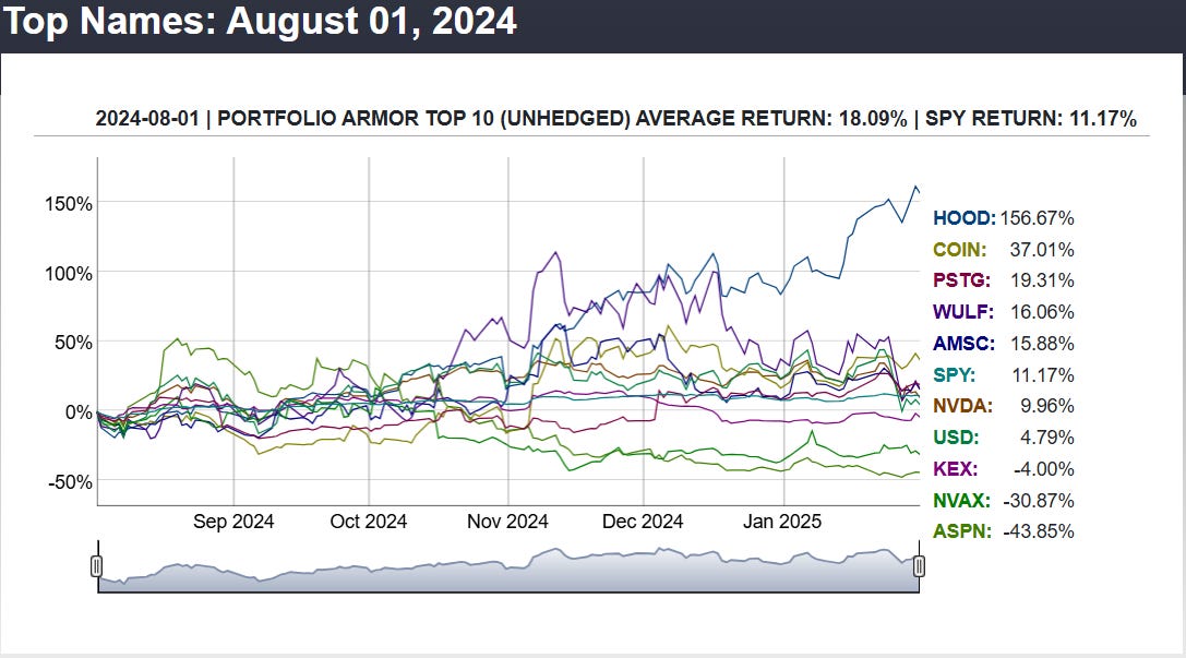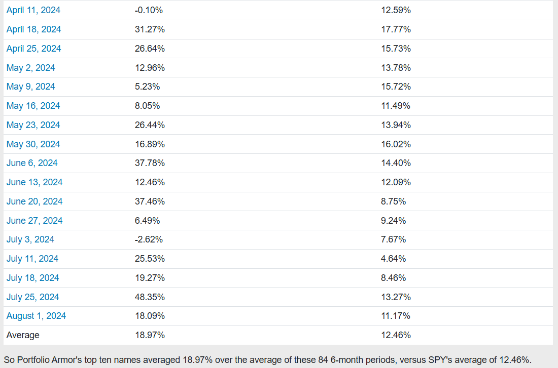 Before we get to this week’s top ten names, let’s look at the final, 6-month performance of our top ten names from August 1st, 2024.