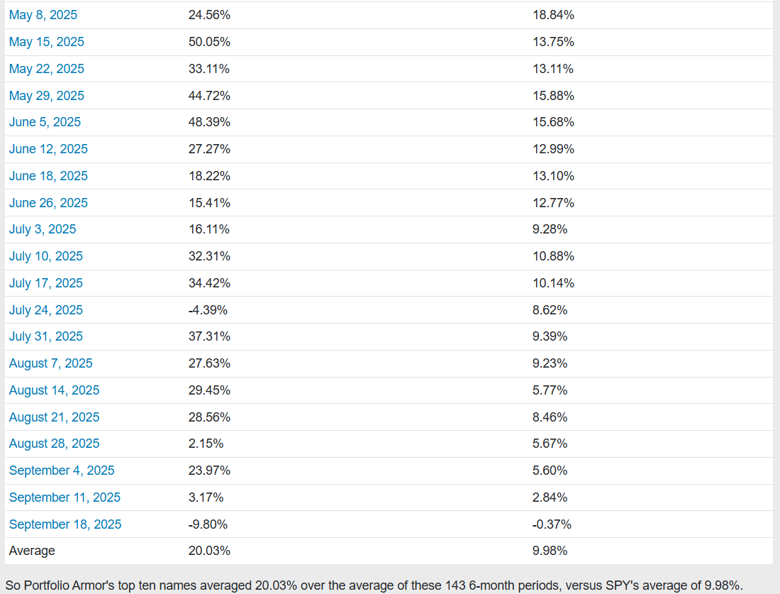 Before we get to this week’s top ten names, let’s look at the final, 6-month performance of our top ten names from 9/18/2025.