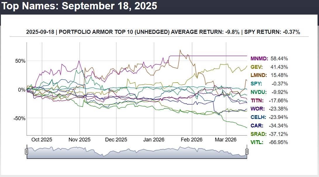 Over the next 6 months, our top ten names from September 18th, 2025 returned -9.8%, versus -0.37% for the SPDR S&P 500 Trust ETF (SPY 0.23%↑).