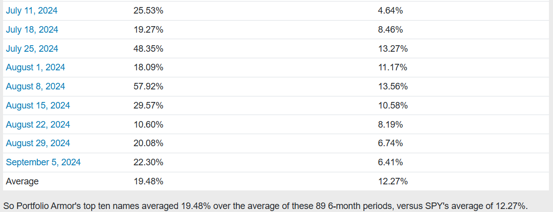 And as you can see above, our top names have averaged returns of 19.55% over the next six months, versus SPY’s average of 12.45%. You can see an interactive version of the table above here, where you can click on each date and see a chart showing each of the holdings that week.