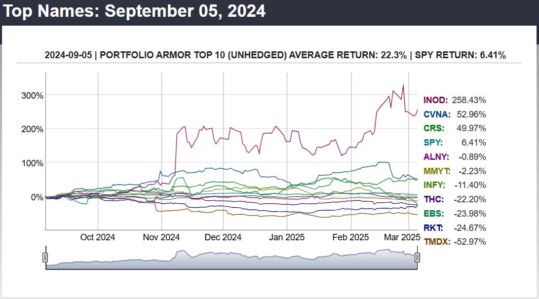 Before we get to this week’s top ten names, let’s look at the final, 6-month performance of our top ten names from September 5th, 2024.