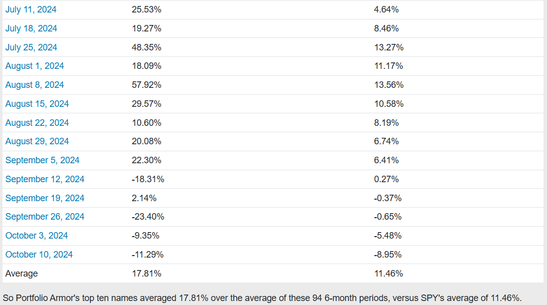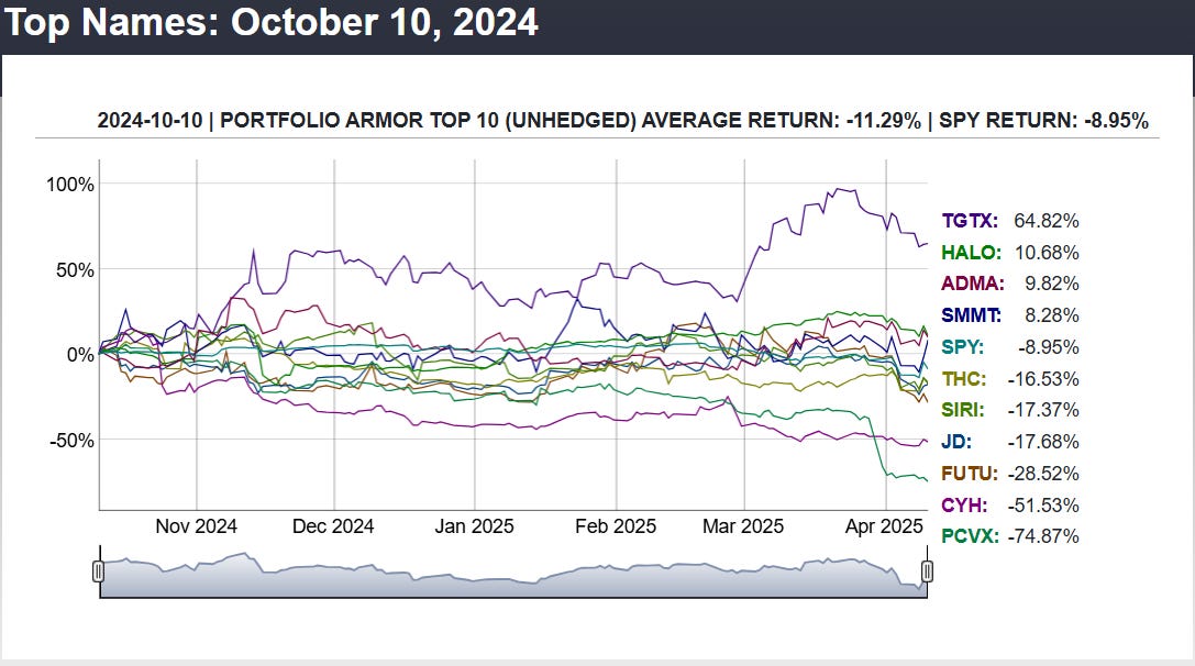 Before we get to this week’s top ten names, let’s look at the final, 6-month performance of our top ten names from October 10th, 2024.