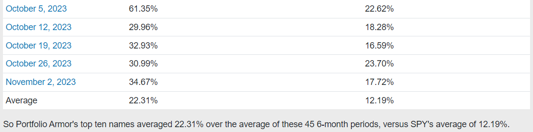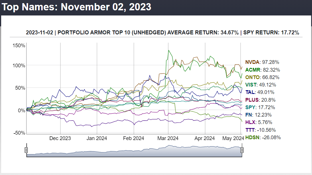 Before we get to this week’s top ten names, let’s look at the final, 6-month performance of our top ten names from November 2nd, 2023.
