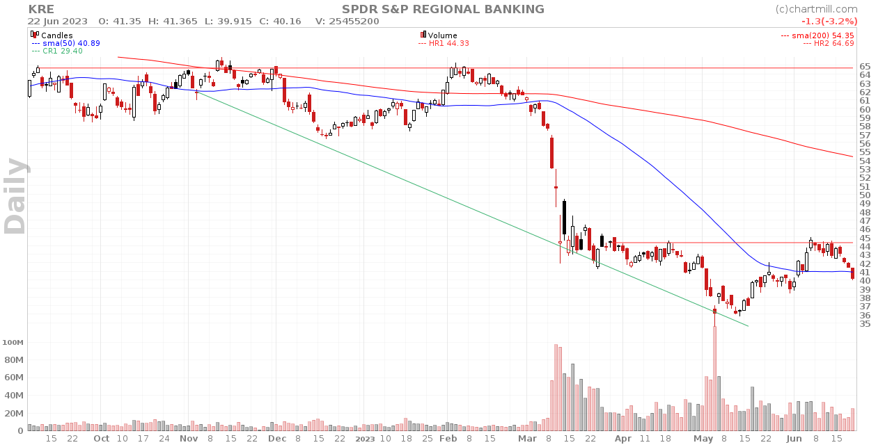 The ETF that tracks regional banks looks like it might be rolling over, having just dropped below its 50-day moving average.