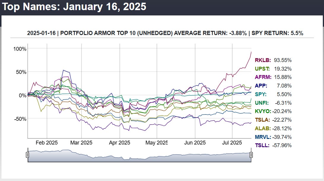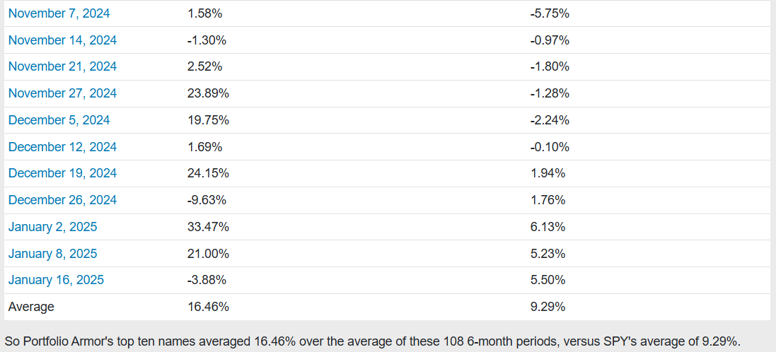 Before we get to this week’s top ten names, let’s look at the final, 6-month performance of our top ten names from January 16th, 2025.
