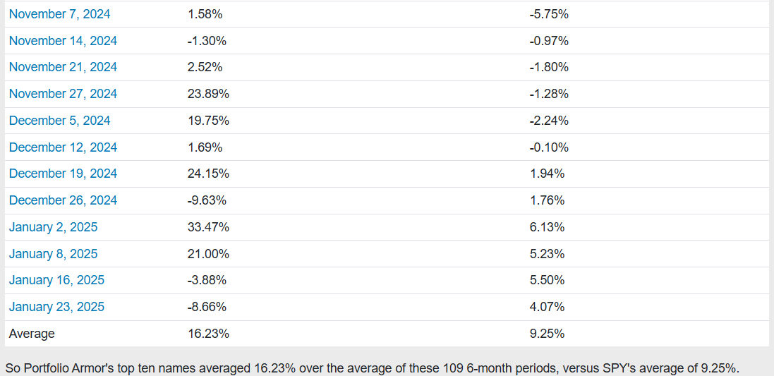 Before we get to this week’s top ten names, let’s look at the final, 6-month performance of our top ten names from January 16th, 2025.