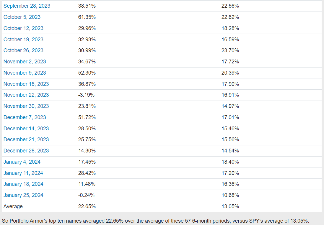 And as you can see above, our top names have averaged returns of 22.65% over the next six months, versus SPY’s average of 13.05%. You can see an interactive version of the table above here, where you can click on each date and see a chart showing each of the holdings that week.