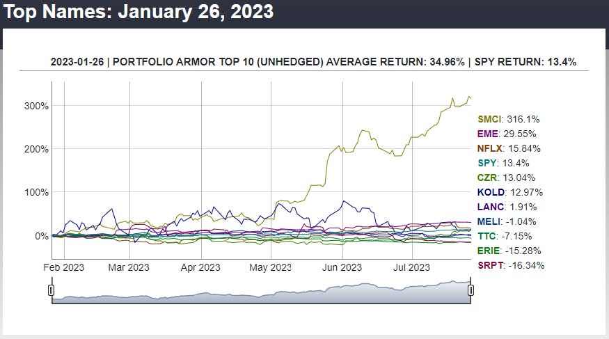 Before we get to this week’s top ten names, let’s look at the final, 6-month performance of our top names from January 26th of this year.