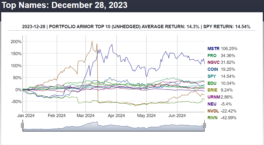 Our core strategy is to buy equal dollar amounts of the Portfolio Armor web app’s top ten names, put trailing stops of 15%-20% on them, and replace them with names from the current week’s top ten when we get stopped out of a position [I got stopped out of a top name from last year, PulteGroup (PHM 0.00%↑), for a 52% gain earlier this week, so I plan to buy one of this week’s top names on Friday].