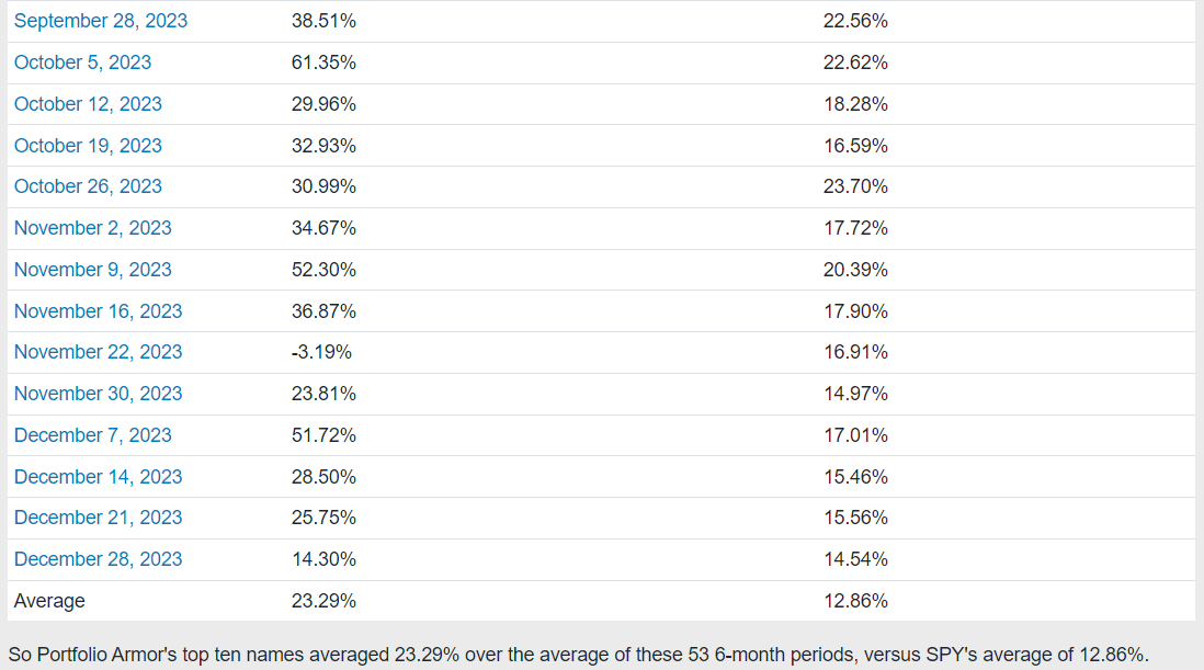 And as you can see above, our top names have averaged returns of 23.29% over the next six months, versus SPY’s average of 12.86%. You can see an interactive version of the table above here, where you can click on each date and see a chart showing each of the holdings that week.