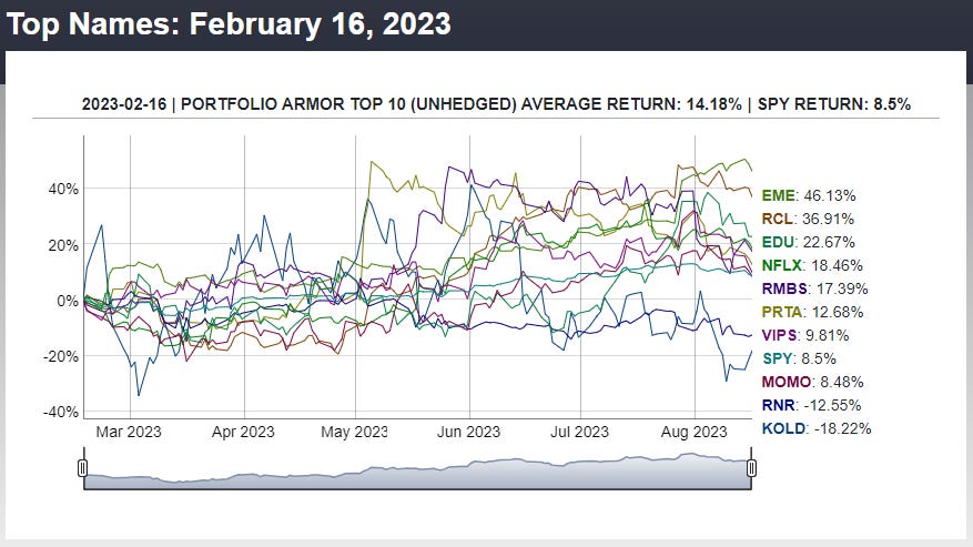 Before we get to this week’s top ten names, let’s look at the final, 6-month performance of our top ten names from February 16th of this year.