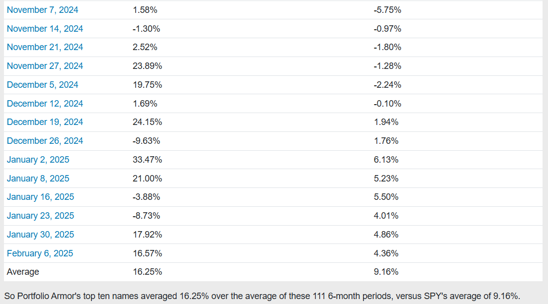 Before we get to this week’s top ten names, let’s look at the final, 6-month performance of our top ten names from February 6th, 2025.