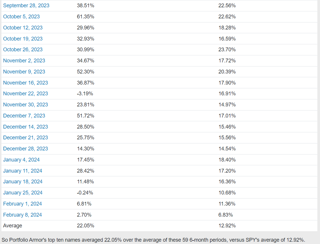 And as you can see above, our top names have averaged returns of 22.08% over the next six months, versus SPY’s average of 12.92%. You can see an interactive version of the table above here, where you can click on each date and see a chart showing each of the holdings that week.