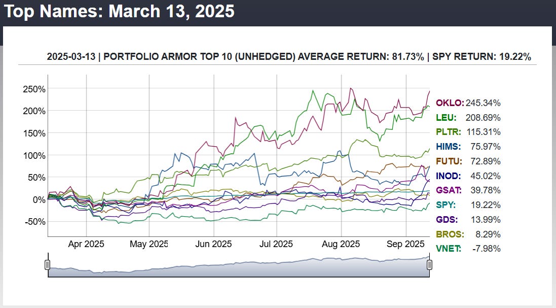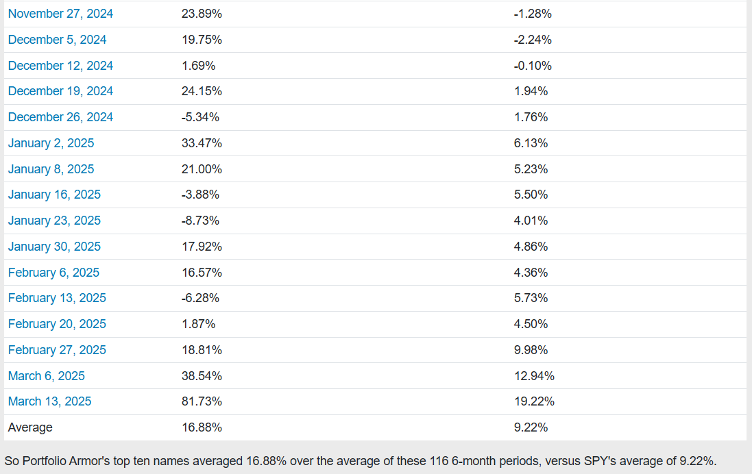 Before we get to this week’s top ten names, let’s look at the final, 6-month performance of our top ten names from 3/13/2025.