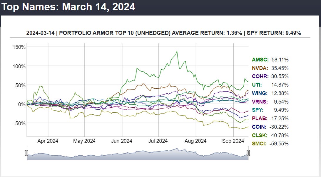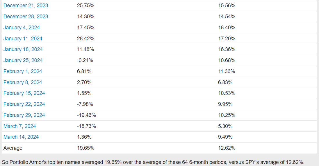 Before we get to this week’s top ten names, let’s look at the final, 6-month performance of our top ten names from March 14th, 2024.