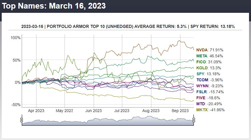 We’ve had a number of number of new subscribers this week, so here’s a brief explanation of our core strategy. Our core strategy is to buy equal dollar amounts of the Portfolio Armor web app’s top ten names, put trailing stops of 10%-15% on them, and replace them with names from the current week’s top ten when we get stopped out of a position.