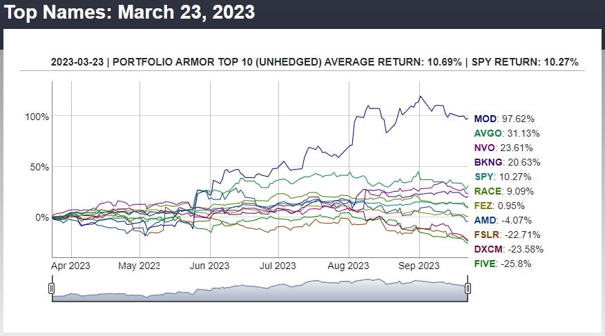 Before we get to this week’s top ten names, let’s look at the final, 6-month performance of our top ten names from March 23rd.