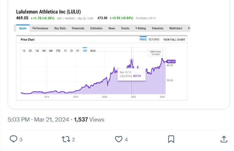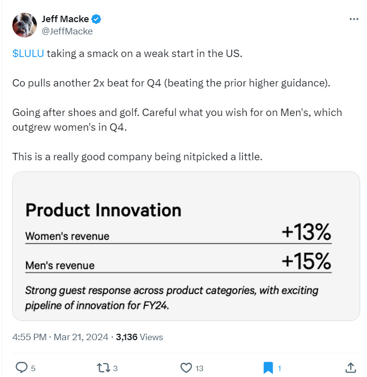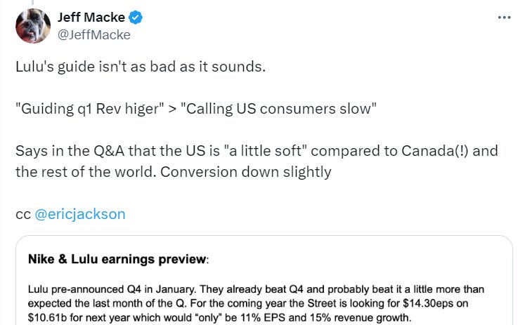 Shares of Lululemon Athletica (LULU 0.00%↑) are down about 15% intraday as I type this, after the company beat on both top and bottom lines after the close yesterday. Ostensibly, the stock’s down because the company released weaker-than-expected guidance for the year, but one of the top retail analysts I follow, Jeff Mackey, feels that the market is overreacting here.