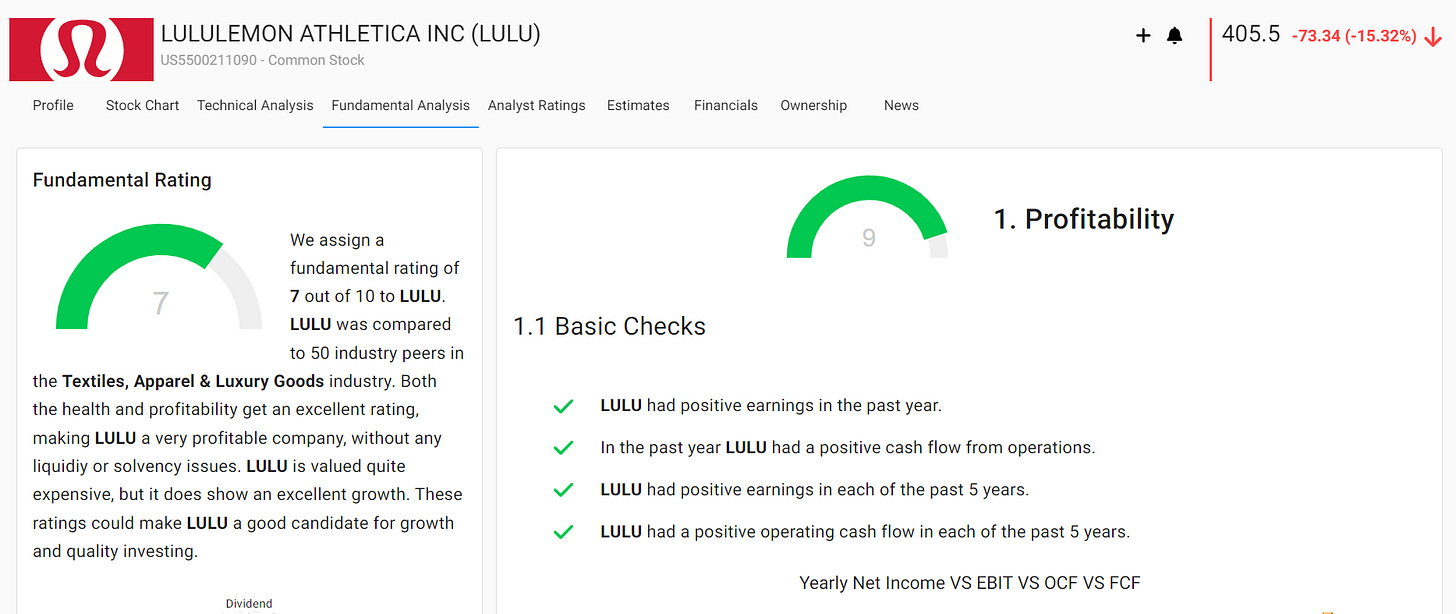 Chartmill gives the company a good (7 out of 10) overall fundamental rating, and even higher ratings for profitability (9) and growth (8). The one weak rating as of yesterday’s close was valuation (a 2), but that should be improved somewhat after today’s drop.