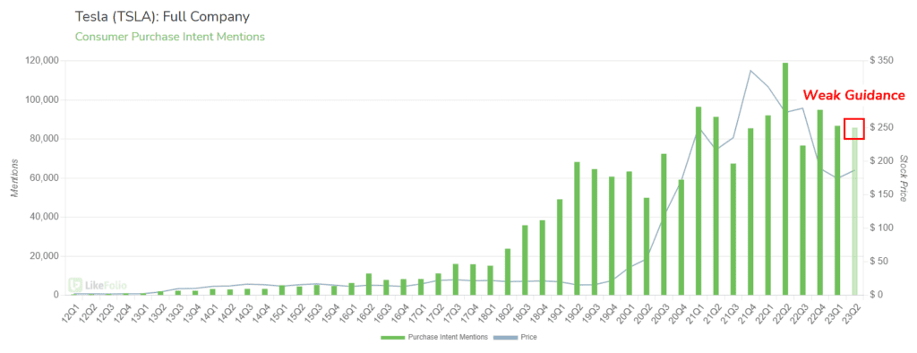 While LikeFolio data can’t speak to Tesla’s margins, it can speak to the number of consumers purchasing a Tesla vehicle.