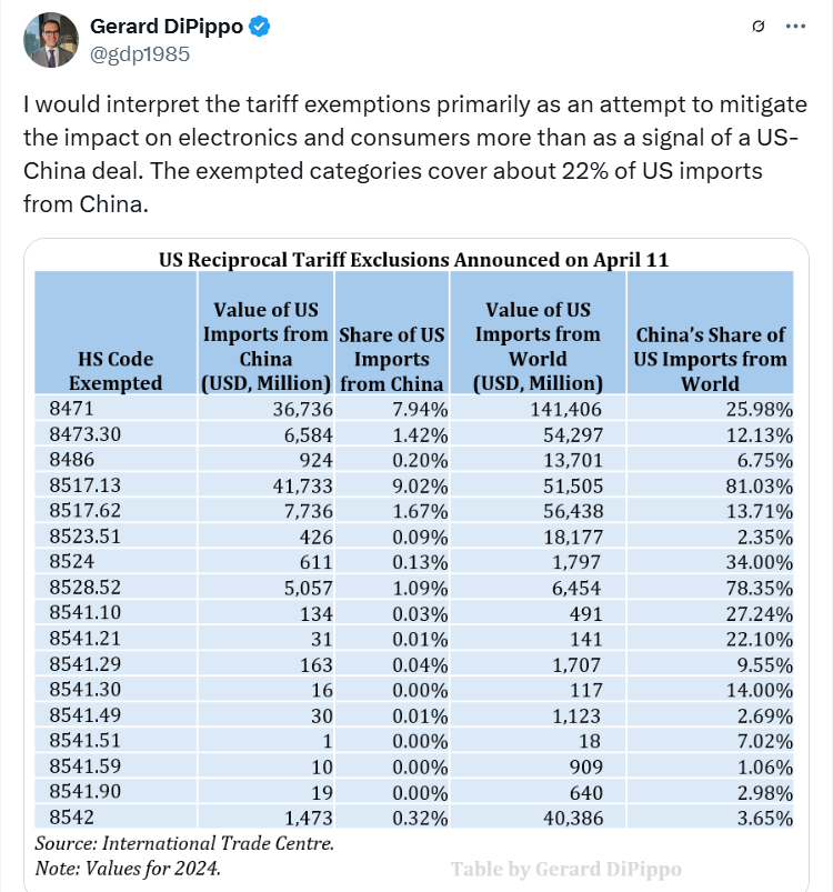 The ostensible reason why the market is rallying today is the news from Friday night that the Trump administration was exempting items such as laptops and smart phones from its latest round of “reciprocal” tariffs on China. But there seems to be less tariff relief there than meets the eye: