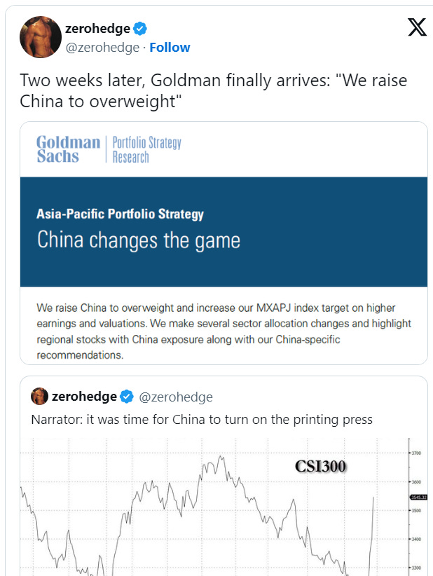 On Sunday, ZeroHedge noted on X that Goldman Sachs finally acknowledged that China's stimulus-fueled rally is likely to have legs.