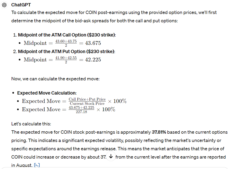 To figure out what kind of upside to aim for, I looked at the expected move for COIN going out to September 20th (the first options expiration date after it releases earnings again in August). I had ChatGPT run the numbers for me based on my inputs: