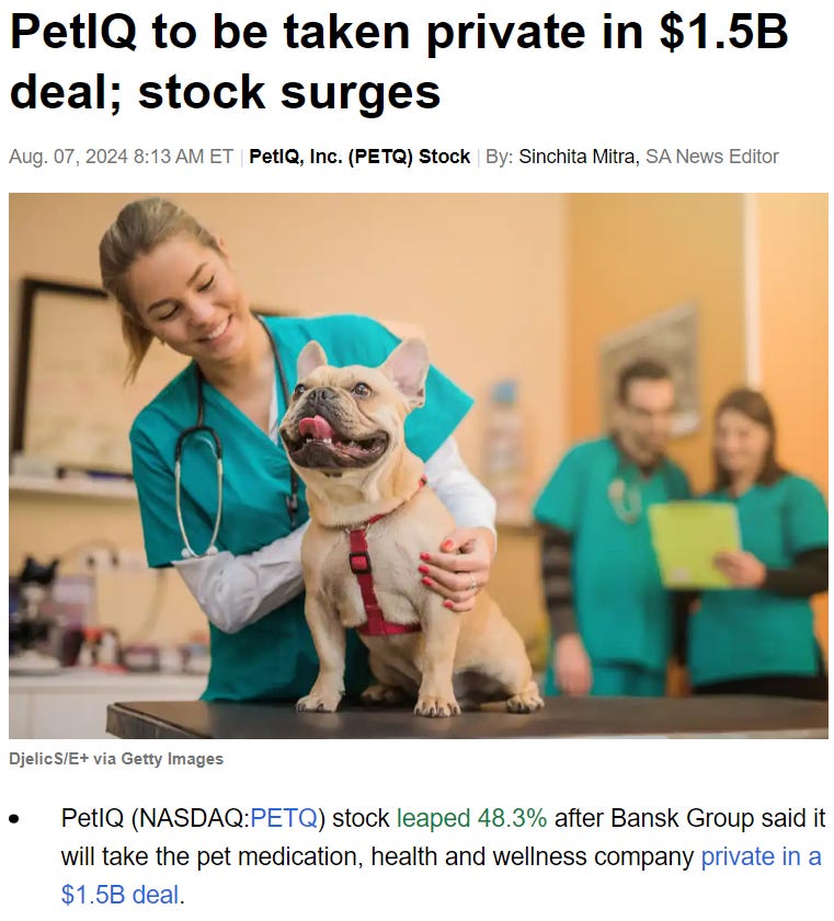 PETQ announced today that it's getting taken private at $31 per share. At that price, the intrinsic value of the calls we bought for $2.50 is $8.50.