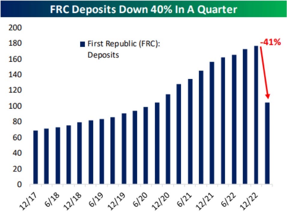 As it turns out, we were right. FRC announced during its earnings call after the close on Monday that its deposits had dropped by more than 40% in the first quarter. As expected, this news led to a sharp decline in FRC's share price (as I type this Tuesday afternoon, the stock is trading near $9, down more than 40% on the day.