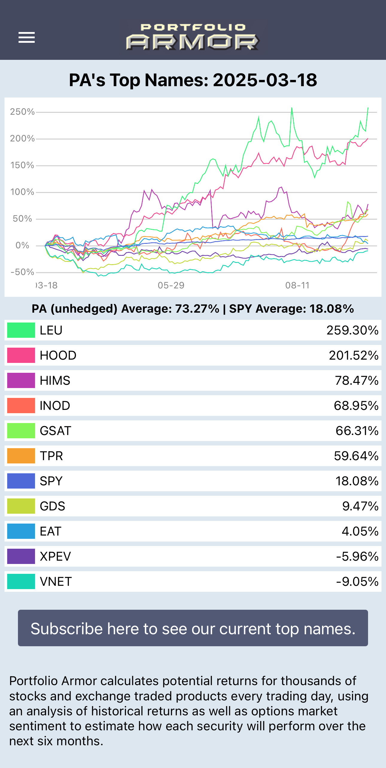 As regular readers remember, our system’s top names have, on average, beaten the market. Returns can be lumpy—we might have a losing streak for several weeks—but when our top names hit, they can hit big, as was the case with our March 18th cohort. .