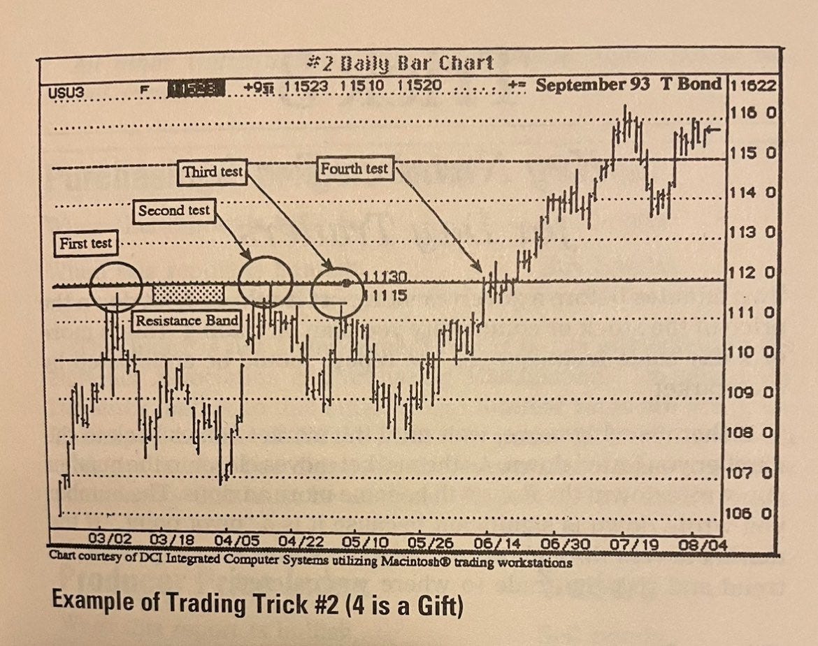 A veteran trader I follow on X has been bullish on for a few months, and is now more bullish on it based on the chart above, which he shared. That chart describes the movement of Treasury bonds in 1993, but the same technical phenomenon is at work here, a security testing its resistance level three times, before breaking through a fourth time. That trader expects this stock to run another 50 points from here, so we’re going to buy calls on it about 35 points out of the money. If he’s right, our gains could be 700% or more on these.