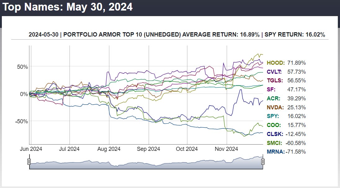 Our most recent top names cohort to finish its 6-month run, was this one, from May 30th. It only did fractionally better than SPY 0.00%↑, thanks to 2 names that were down more than 60%, SMCI 0.00%↑ and MRNA 0.00%↑. But if we placed the kinds of options bets we are placing now on any of the top five names below— HOOD 0.00%↑, CVLT 0.00%↑, TGLS 0.00%↑, SF 0.00%↑, or ACR 0.00%↑—we would likely have had gains of ~200% or more on all of them.