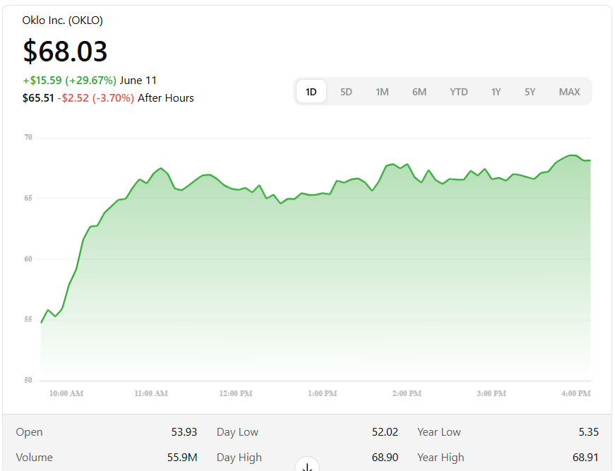 Coincidentally, both rose on Department of Defense news. Looks like OUST is getting a contract for its LIDAR and OKLO was selected to provide a modular nuclear reactor for an Air Force base in Alaska.