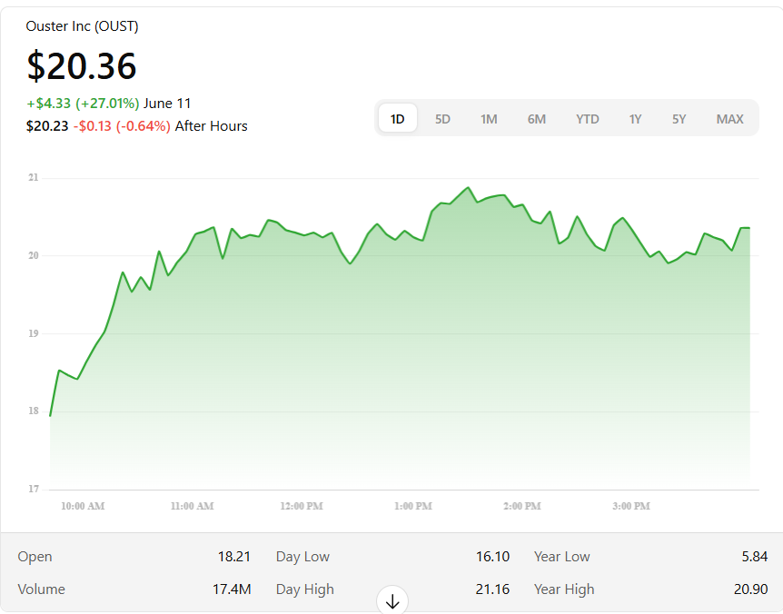 Ouster (OUST 0.00%↑), which had been discussed on my Market Watchers list, was up more than 27% on the day.