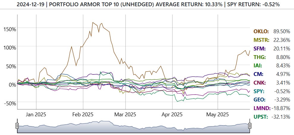 The average return of Portfolio Armor’s top ten names over the next six months was 16.68%, versus 9.88% for S&P 500-tracking ETF SPY 0.00%↑. So it’s been a good source of alpha for us.