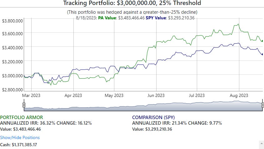 Let’s say you had $3,000,000 to invest on February 24th of this year, and were unwilling to risk a decline of more than 25% over the next six months (the hedged portfolio method works for portfolios as small as $30,000, too, but here were using a larger example).