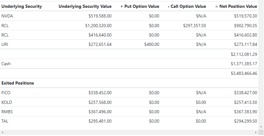 The site started by putting equal dollar amounts into 7 top names, and then it rounded those dollar amounts down to round lots (share counts divisible by 100) to lower hedging costs. Then it swept most of the leftover cash from that process into a tightly collared position in Royal Caribbean Cruises (RCL 0.00%↑).