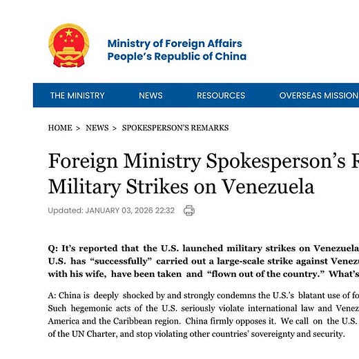 As analyst Neil Thomas noted on X, China’s foreign ministry said it was “deeply shocked” by the U.S. strikes and Maduro’s removal—a phrase Chinese diplomats reserve for very serious events like major terror attacks or assassinations. They also accused Washington of trampling Venezuelan sovereignty and threatening peace in Latin America and the Caribbean. You can read his breakdown here: