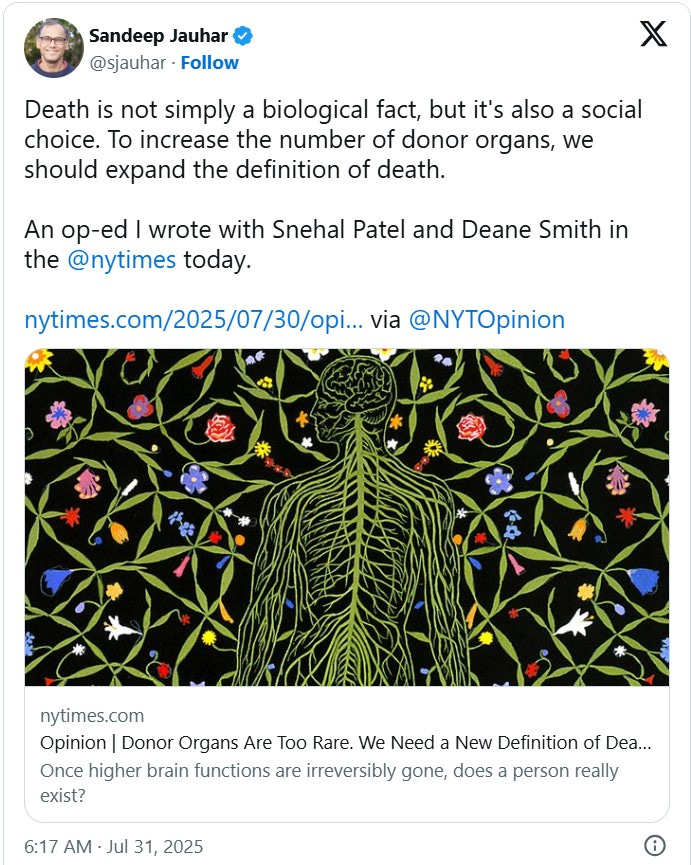 The NY Times flips on organ donations. On 7/31, they published an op-ed saying medicine should expand the definition of death so companies like TransMedics can harvest more organs from patients.