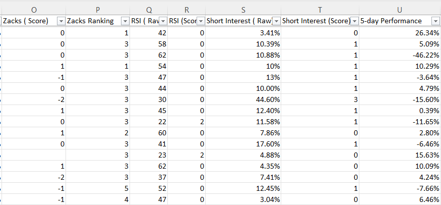 For each stock I evaluate each week (not just the ones I place trades on), I enter the data above in a spreadsheet, and at the end of the week, I record each stock’s 5-day return.