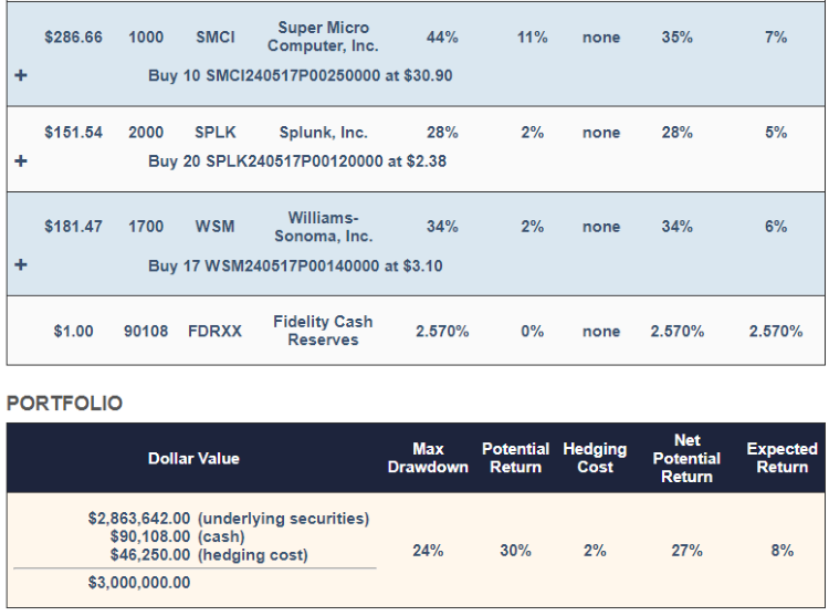 In the case of SMCI, for example, that algorithm determined it was best to pay 11% of position value to hedge with puts, in order to have uncapped upside. 11% sounds like it would be a huge drag on returns, but SMCI was up 195% over the next six months, so our hedging algorithm got that one right, and it paid off.