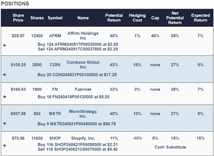 The underlying securities in this portfolio were the names our system estimated had the highest potential returns, net of hedging costs, over the next six months: Affirm Holdings, Inc. (AFRM 0.00%↑), Coinbase Global, Inc. (COIN 0.00%↑), Fabrinet (FN 0.00%↑), MicroStrategy, Inc. (MSTR 0.00%↑), Super Micro Computer, Inc. (SMCI 0.00%↑), Splunk, Inc. [which was later acquired by Cisco Systems, Inc. (CSCO 0.00%↑ )], and Williams Sonoma, Inc. (WSM 0.00%↑).